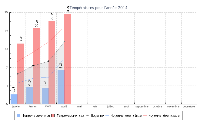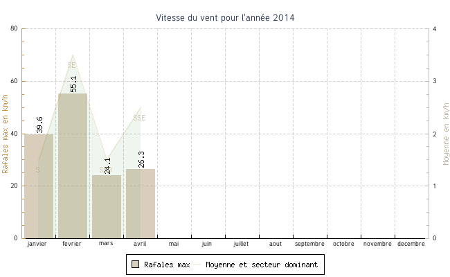 | avril | 6.2 °C | 10.1 °C | 24.5 °C | 20.2 °C | 15.4 °C | 2.5 km/h | 26.3 km/h | SSE |